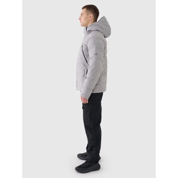 Kurtka puchowa z kapturem męska jest wyposażona w odpinany kaptur z regulacją objętości. Szyję osłania wysoki kołnierz, który dodatkowo zabezpieczy przed chłodem i wiatrem. Rękawy zakończone są mankietami bez regulacji. Przedłużone wewnętrzne dzianinowe mankiety osłonią nadgarstki przed zimnym wiatrem. Po bokach znajdują się 2 kieszenie zapinane na zamek. Dodatkowo na klatce piersiowej umieszczono 2 kieszenie z zapięciem na zamek. Natomiast w środku znajduje się kieszeń z zapięciem na zamek, która pozwala na bezpieczny transport cennych przedmiotów, np. telefonu.Kurtka puchowa dla mężczyzny jest zapinana na jednokierunkowy zamek główny z wewnętrzną i zewnętrzną plisą przeciwwiatrową, która ogranicza przenikanie chłodu do wnętrza kurtki. Obwód dołu można wyregulować przy użyciu tunelowego ściągacza ze stoperami.