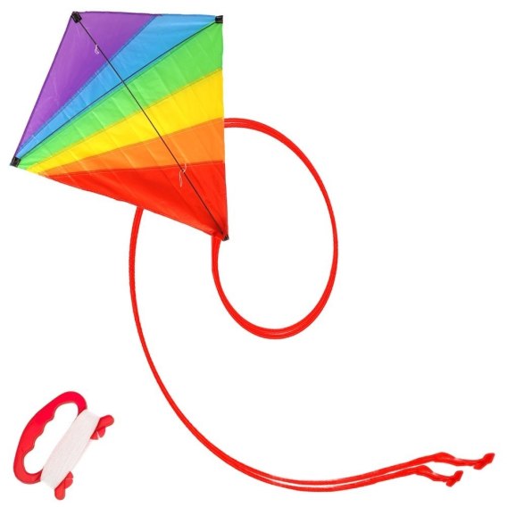 Latawiec w klasycznym kształcie oraz tęczowych kolorach. Żywe kolory latawca sprawią, że będzie pięknie prezentował się na niebie. Dodatkowo posiada długi ogon, który powiewa na wietrze. Latawiec jest lekki, posiada wygodny uchwyt wraz z linką, który możemy stabilnie złapać w dłoni i odpowiednio manewrować latawcem. Zabawa latawcem to świetny sposób na spędzenie czasu zarówno dla dzieci jak i dorosłych.
